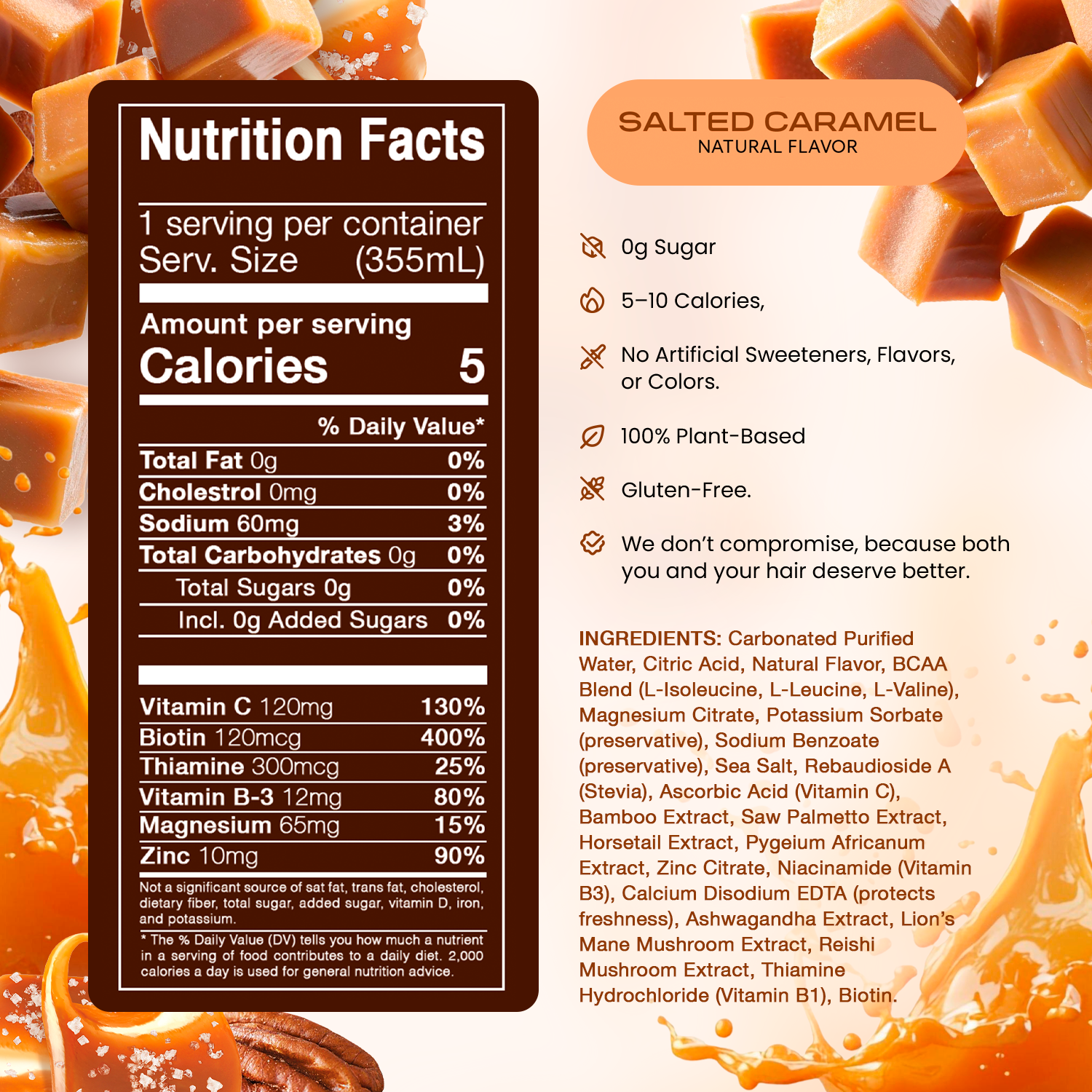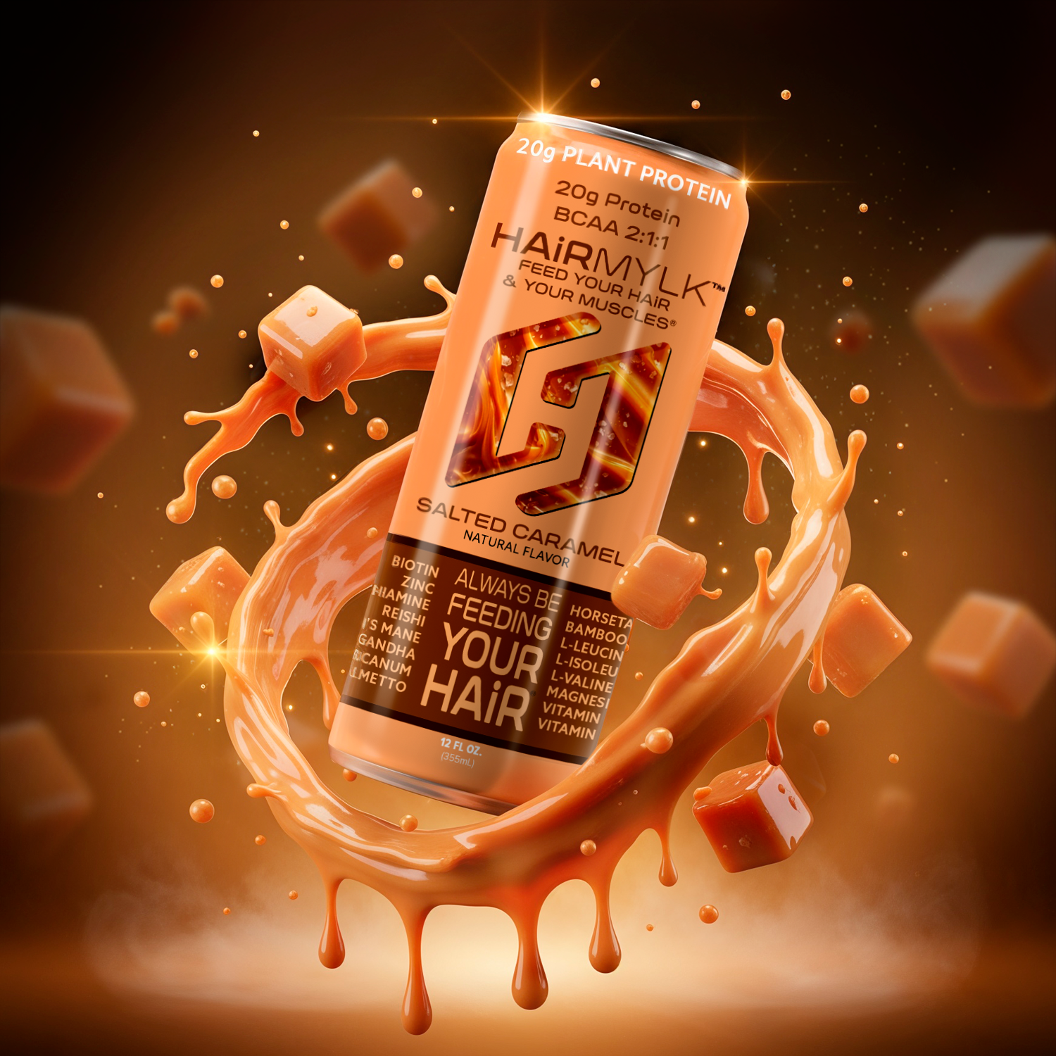 Savor the rich, perfectly balanced taste of HAiR MYLK™ – a natural Salted Caramel delight, naturally sweetened with zero sugar and just 5 calories. Packed with 20 grams of plant-based protein and BCAA 2:1:1 – the essential building blocks for muscle growth – this drink powers your body and more. Uniquely fortified with 16 essential amino acids, vital minerals, and nutrients, it nourishes your hair, promoting healthy growth, thickness, strength, and a dazzling shine. No artificial flavors or colors – only pure, natural goodness.