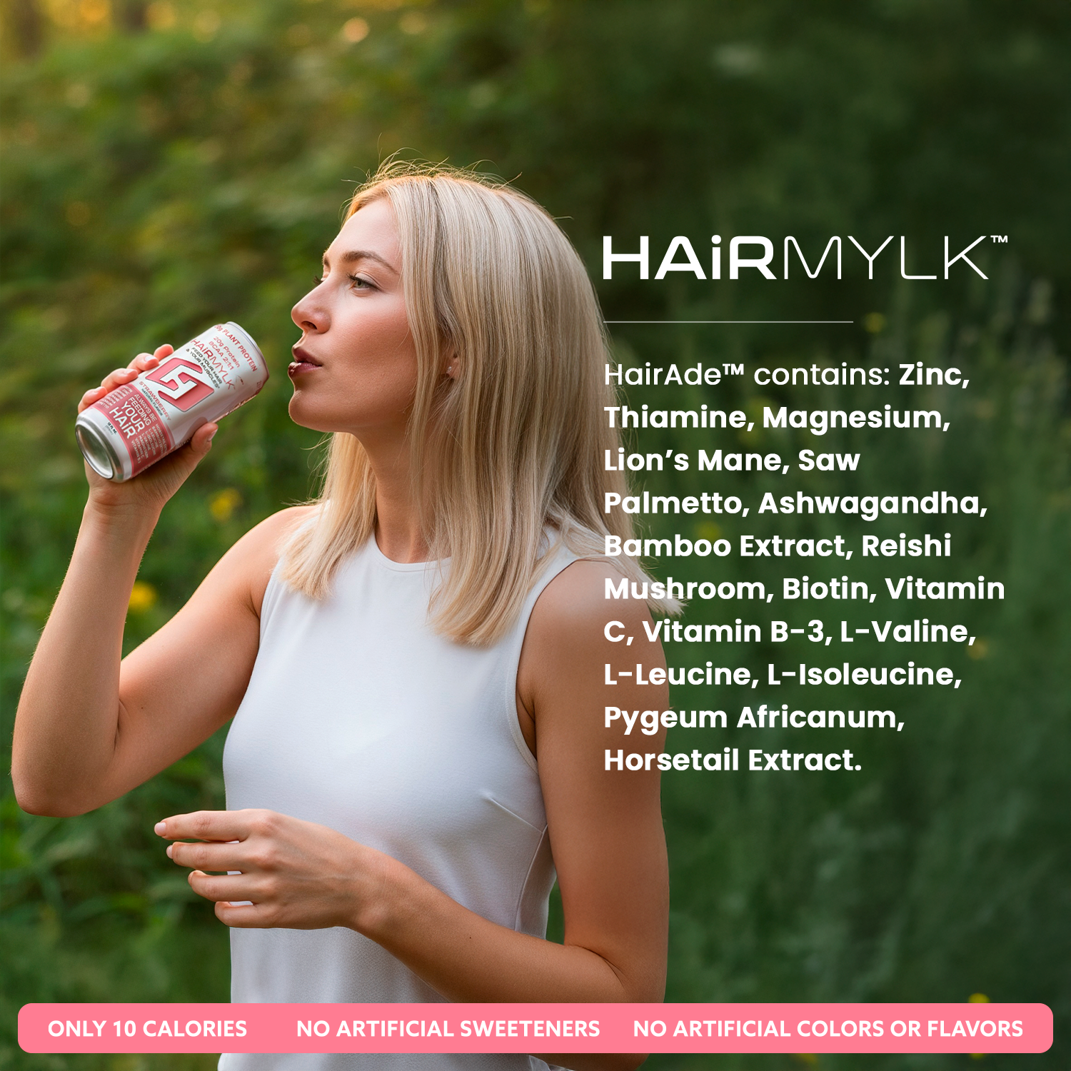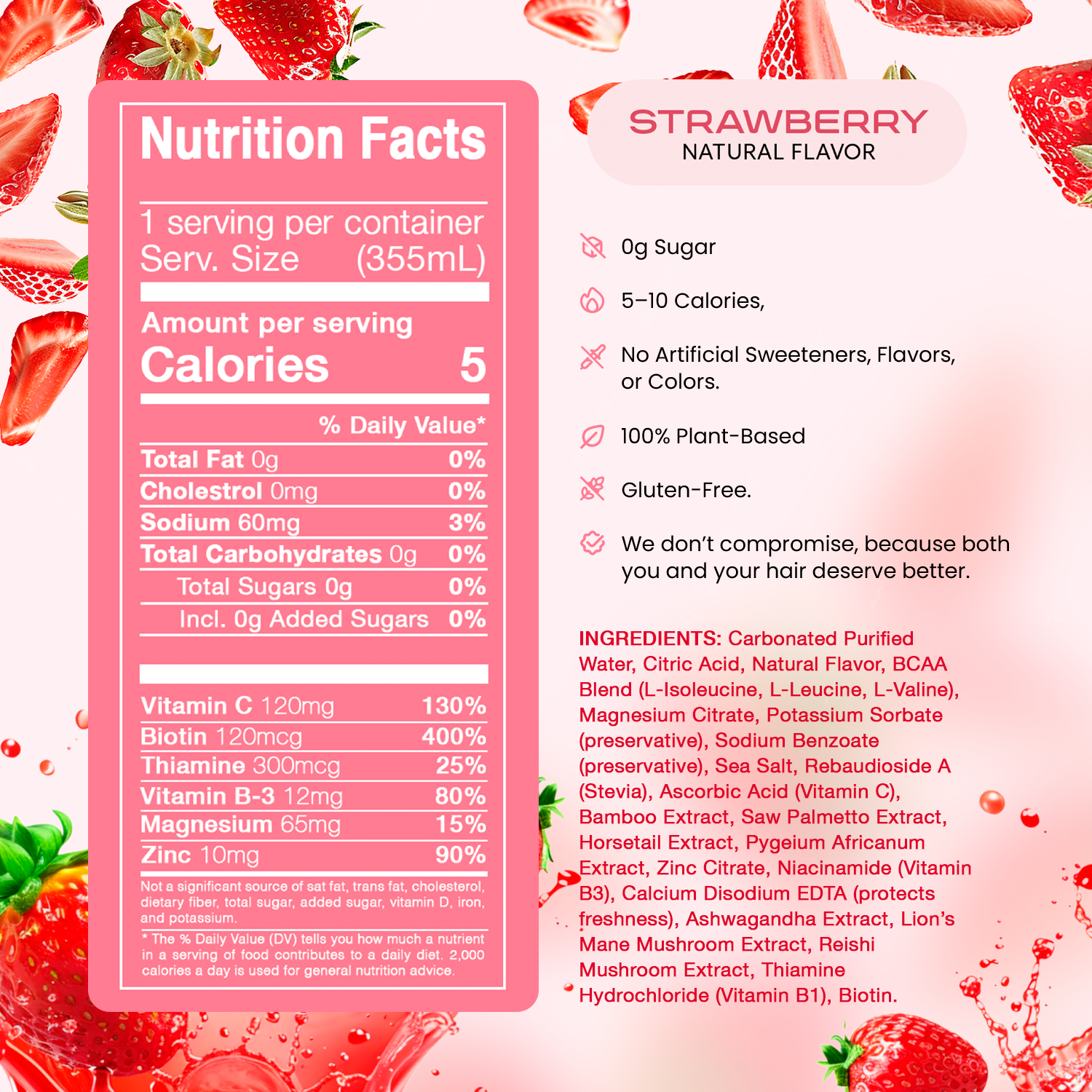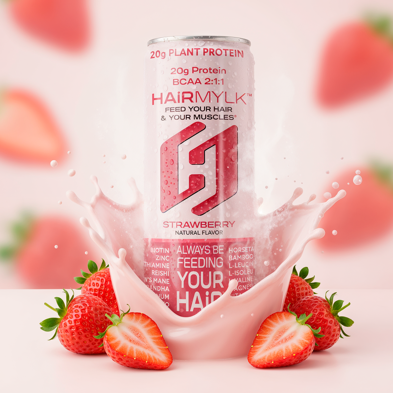 Delight in the vibrant, perfectly balanced taste of STRAWBERRY HAiR MYLK™ – a naturally sweetened strawberry sensation with zero sugar and only 5 calories. Loaded with 20 grams of plant-based protein and BCAA 2:1:1 – the key building blocks for muscle growth – this drink fuels your body while standing out with a unique twist. Infused with 16 essential amino acids, essential minerals, and nutrients, it nurtures your hair, supporting lush growth, thickness, strength, and a stunning shine. Free from artificial flavors or colors – just pure, natural excellence.